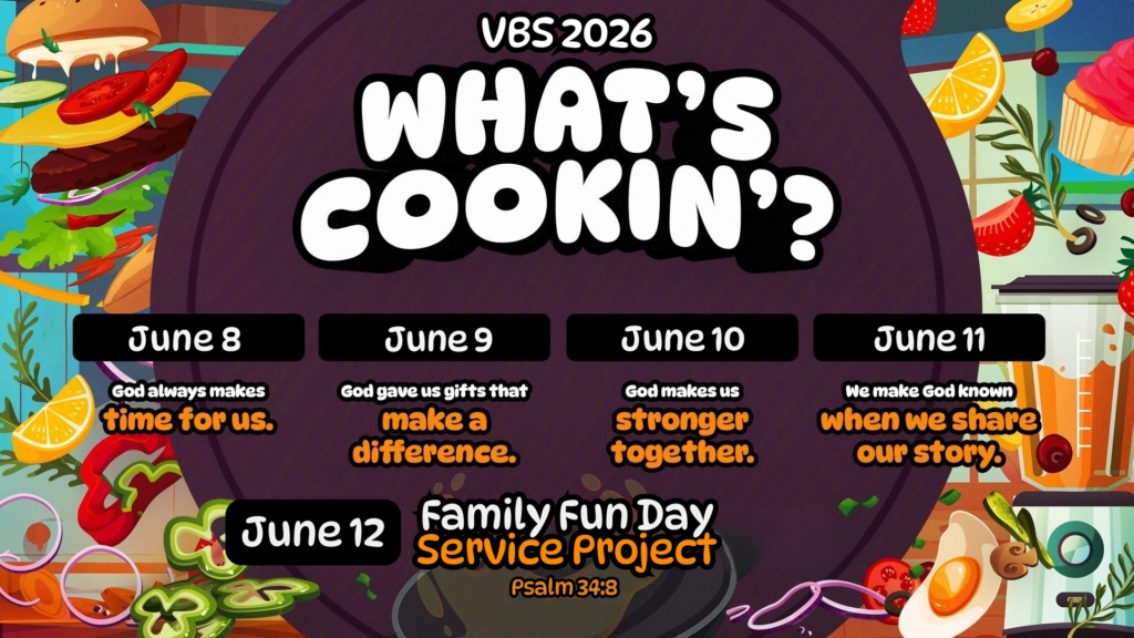 Bring your kids (ages 4 through 5th grade) to VBS: What’s Cookin’? for a week full of FUN, FAITH, and FRIENDSHIP as we explore the ingredients that help us grow closer to God and each other.